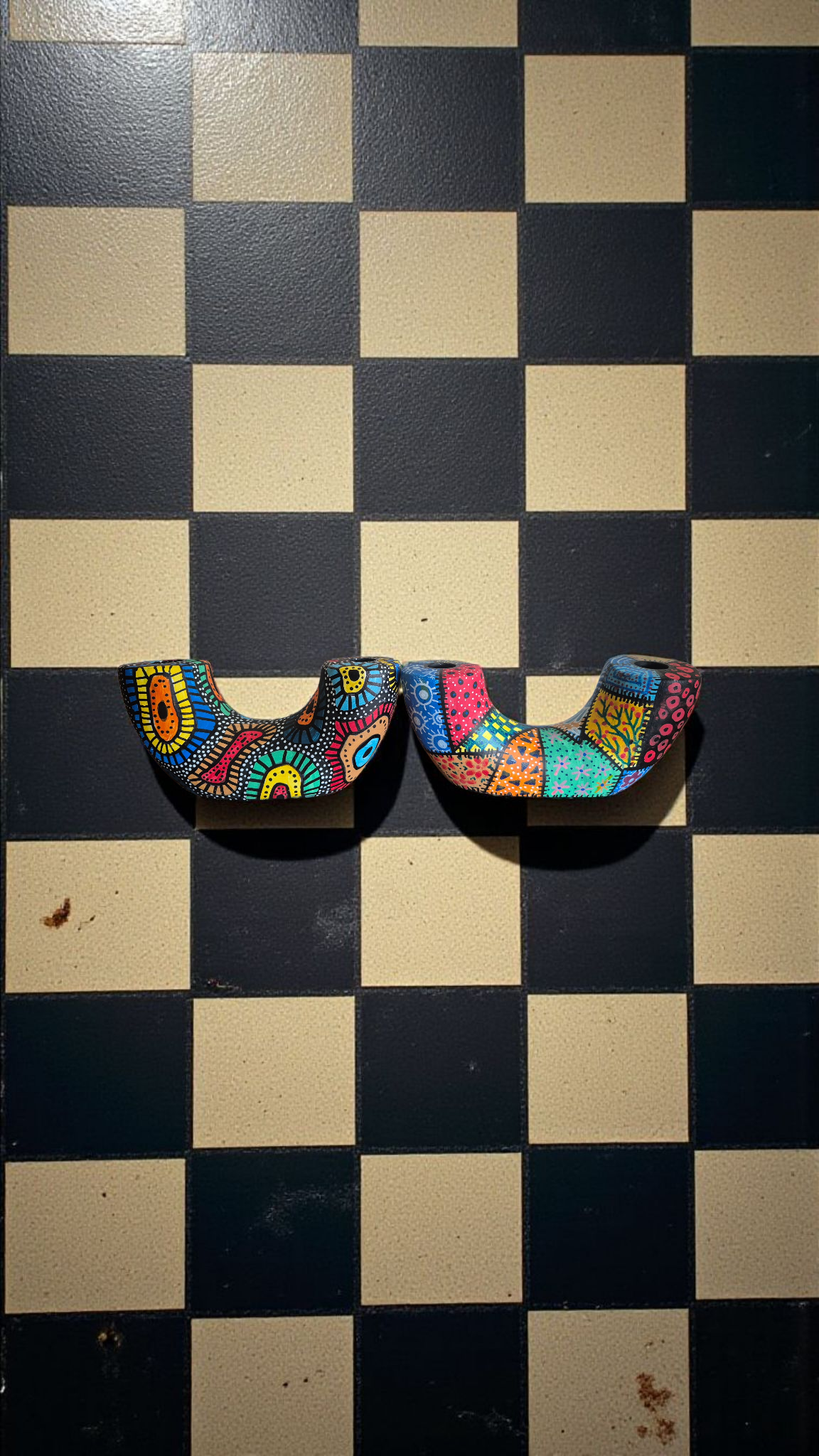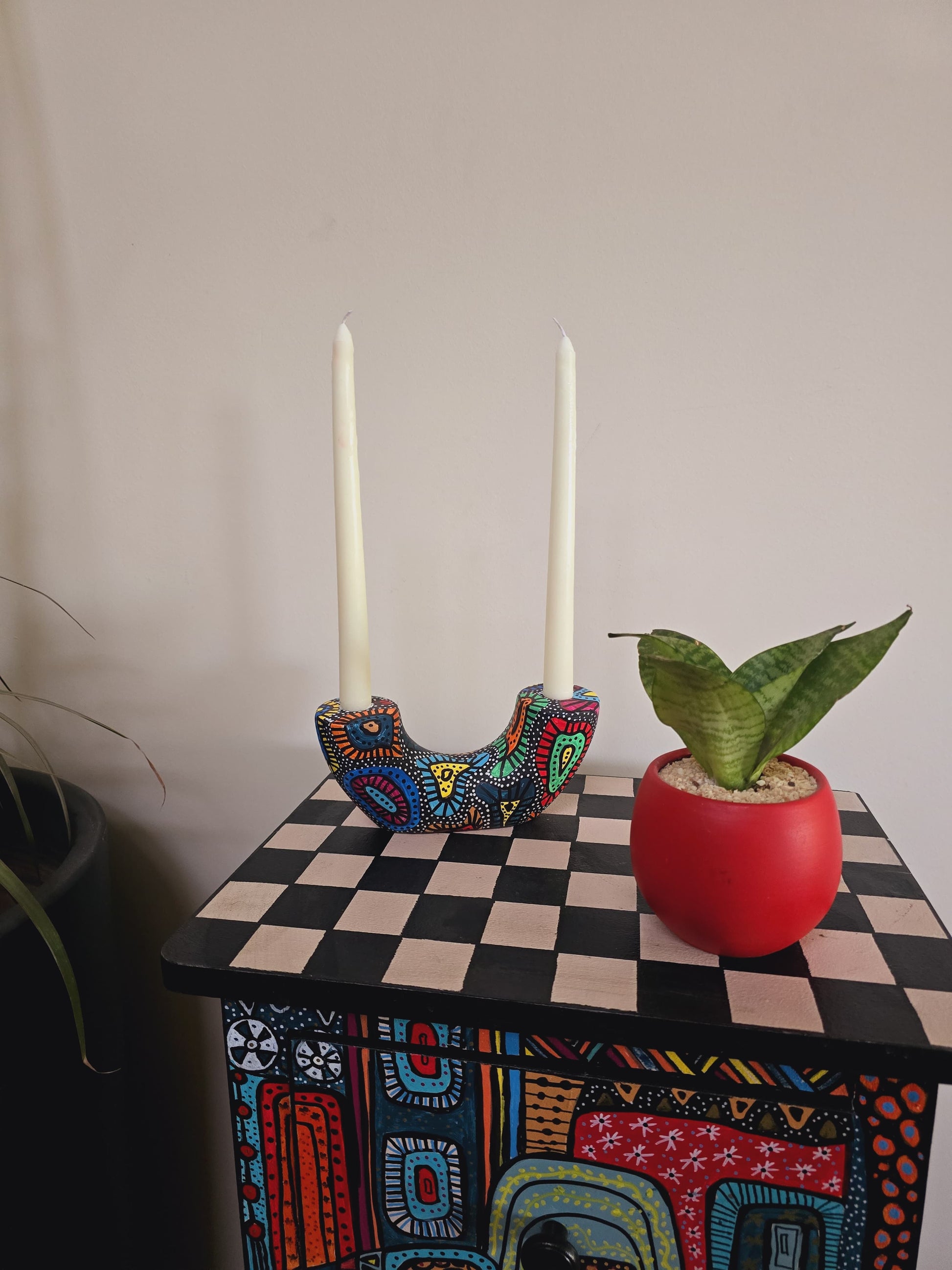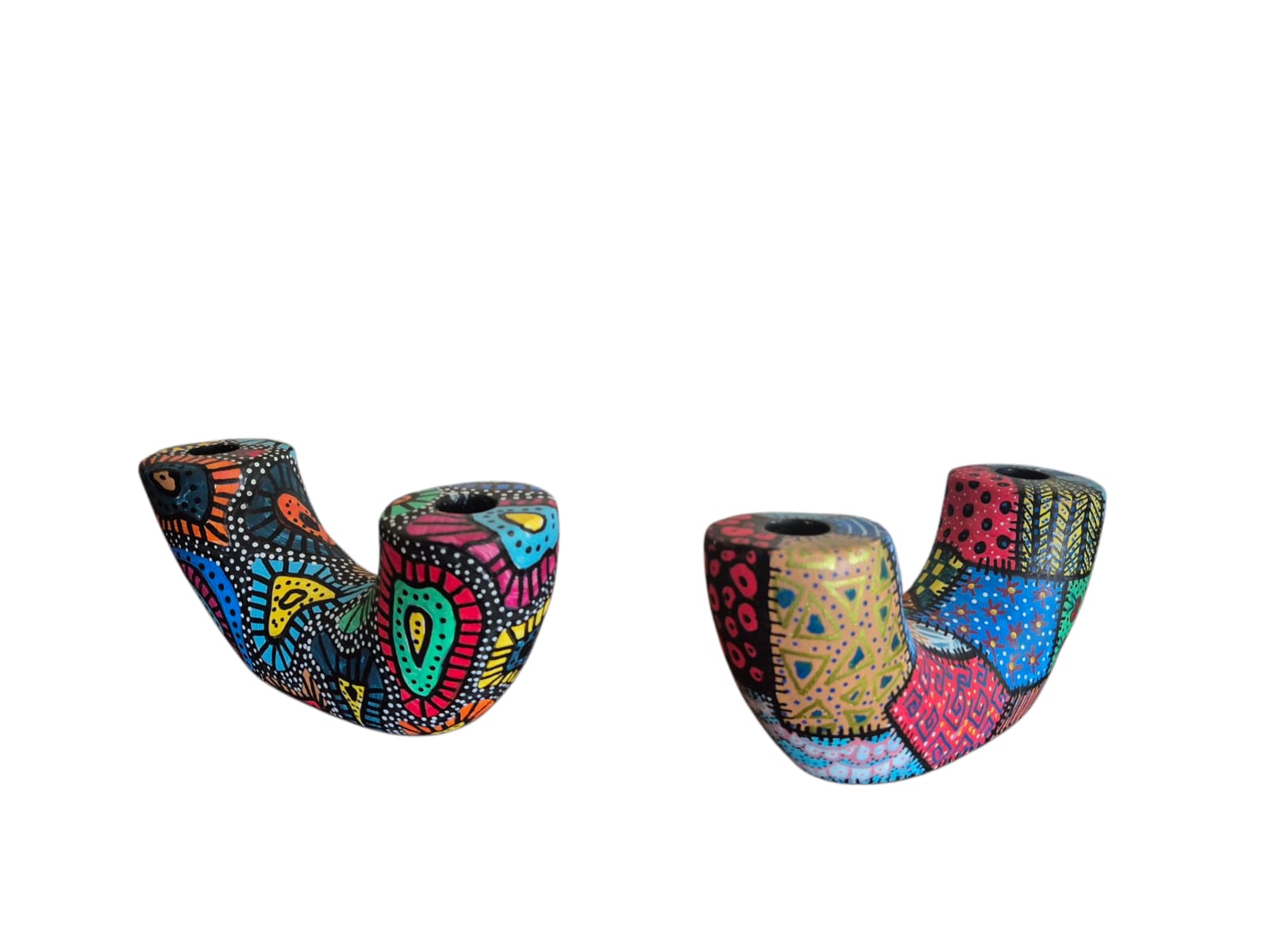 This distinctive U-shaped candle holder is hand-painted by our artisans, showcasing an intricate abstract design in vibrant colors.