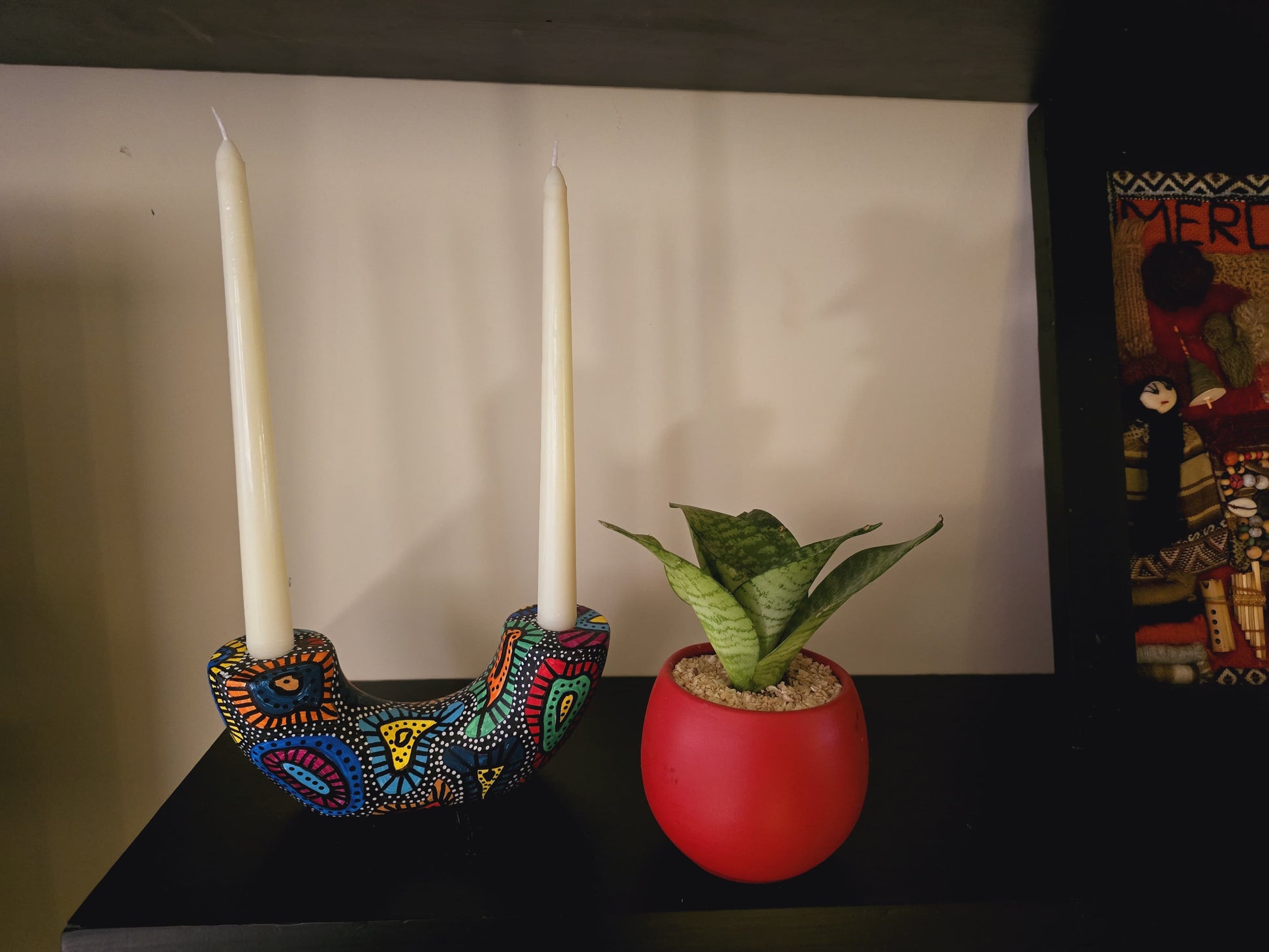 Materials: Hand-painted clay base , accommodates two taper candles (included).