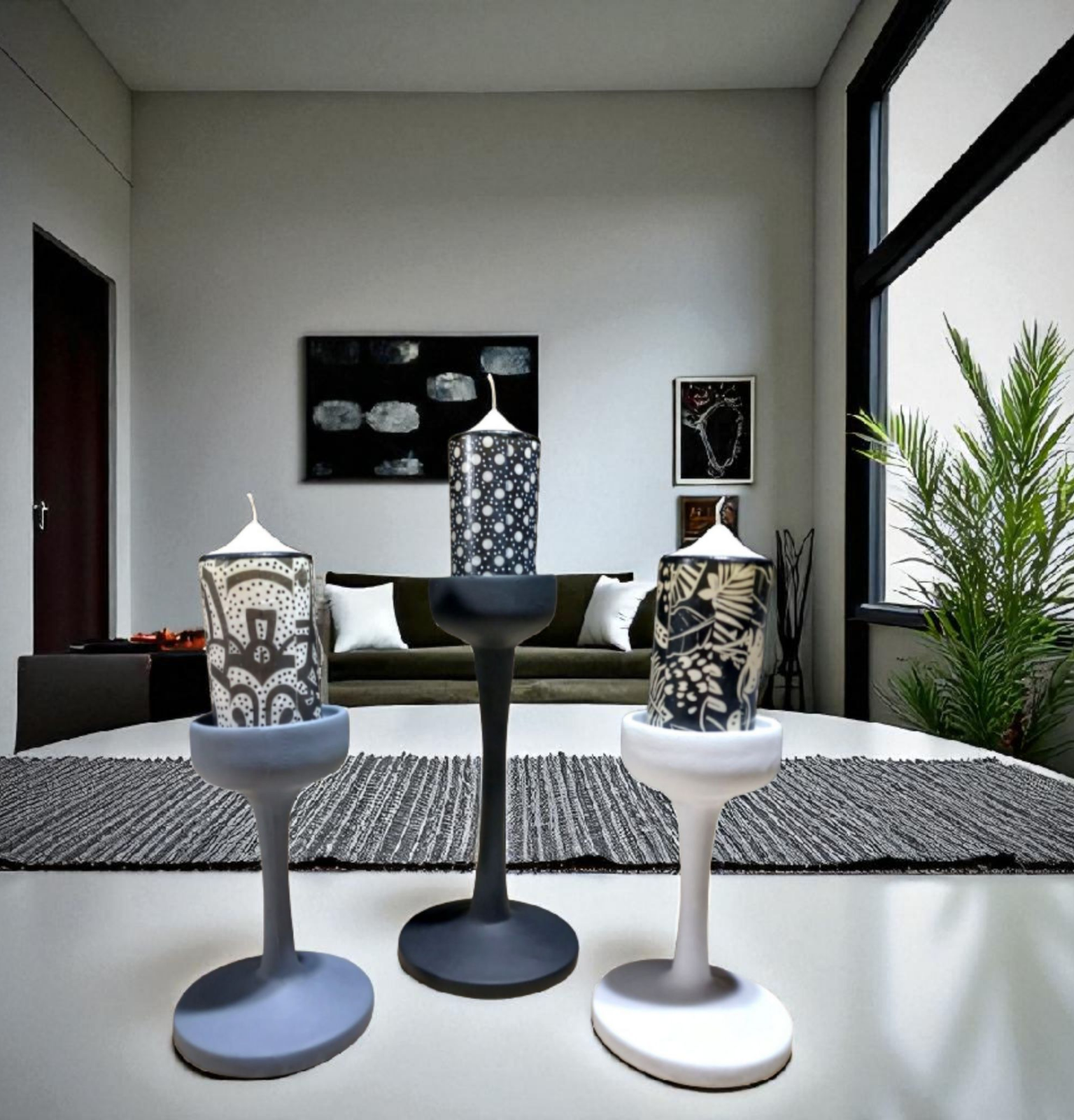 This captivating set of three hand-painted pillar candles and coordinating holders brings striking contrast to your home. Each candle features a unique black and white pattern, paired with sculpted holders in shades of grey, black, and white. It's a functional art piece, handcrafted to offer bold expression and a unique glow to your space.