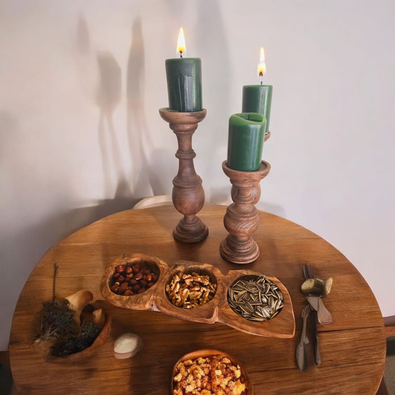 This serene set of three handcrafted wooden candle holders brings natural warmth and rustic elegance to your home. Each piece features a unique, sculpted shape and varied height, showcasing the inherent beauty of raw wood.