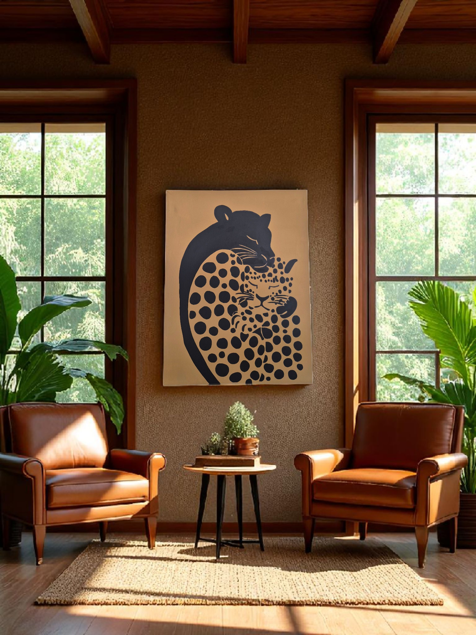 This captivating hand-painted canvas art features two embracing leopards, rendered in a unique, stylized design of dark tones on a warm background. It's a statement art piece, handcrafted to bring bold expression and natural grace to your space.