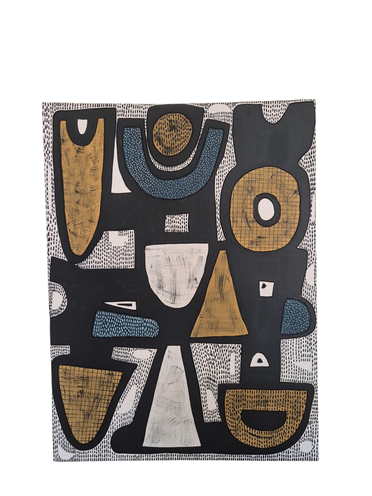 This captivating hand-painted canvas art features a unique abstract composition of organic and geometric shapes. Presented in a serene palette of black, white, gold, and muted blue, it's a statement piece handcrafted to bring grounded sophistication to your walls.